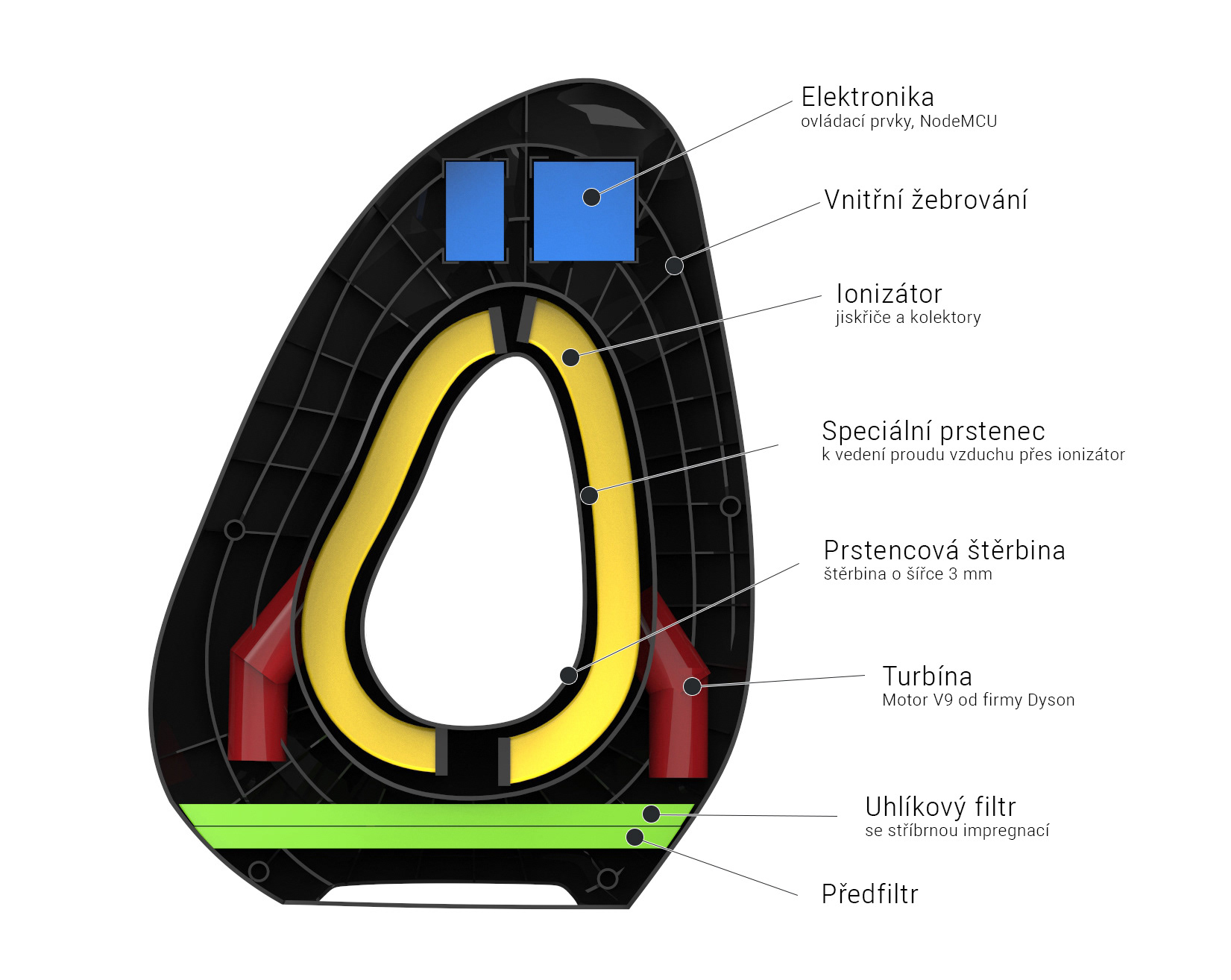 Díky využití knihovny MatériO‘ a gratu Fond vědy FSI 2016 bude čistička vycházet z netradičních materiálů. Jedním z nejzajímavějších prvků návrhu bude technické řešení nasávání. Využitím energeticky a prostorově nenáročných turbín a speciálního prstence je možné využít takzvaný systém bezlopatkových ventilátorů. Toto řešení se u čističek vzduchu téměř neobjevuje, proto by mohlo oslovit velkou základnu zákazníků.
